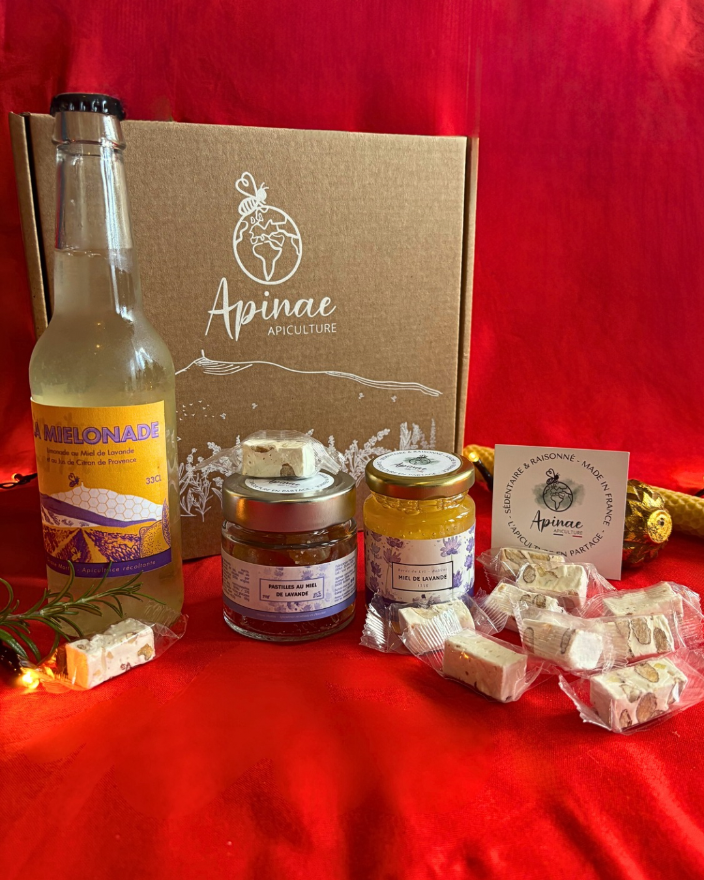 Chaque année, je tiens à compiler un coffret gourmand avec les produits de ma gamme. Avec ce coffret découverte B-Sweet, j’ai décidé de réunir quatre produits artisanaux fabriqués à façon par mes partenaires, à partir du miel phare de ma production, le miel de lavande récolté par mes soins dans le Vaucluse :